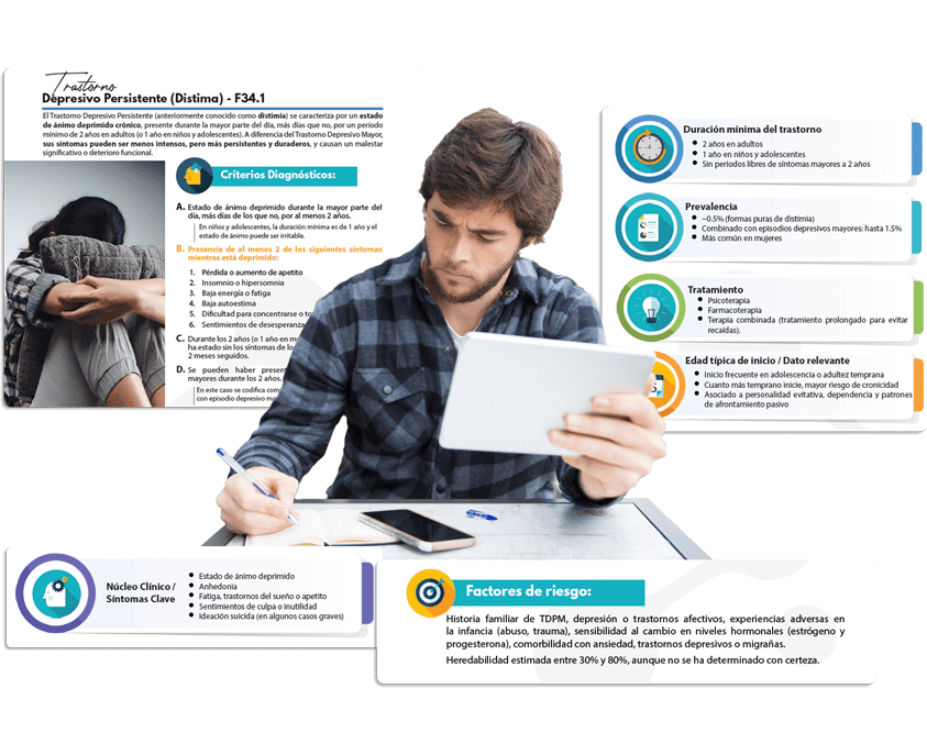 Por ello, hemos creado Psicopatología en Cápsulas©, un material desarrollado con un equilibrio entre rigor técnico y cercanía humana. Su contenido está pensado para que comprendas con claridad los aspectos más importantes de los trastornos mentales, apoyado en indicadores visuales que guían tu estudio y hacen que la información sea fácil de identificar y recordar.